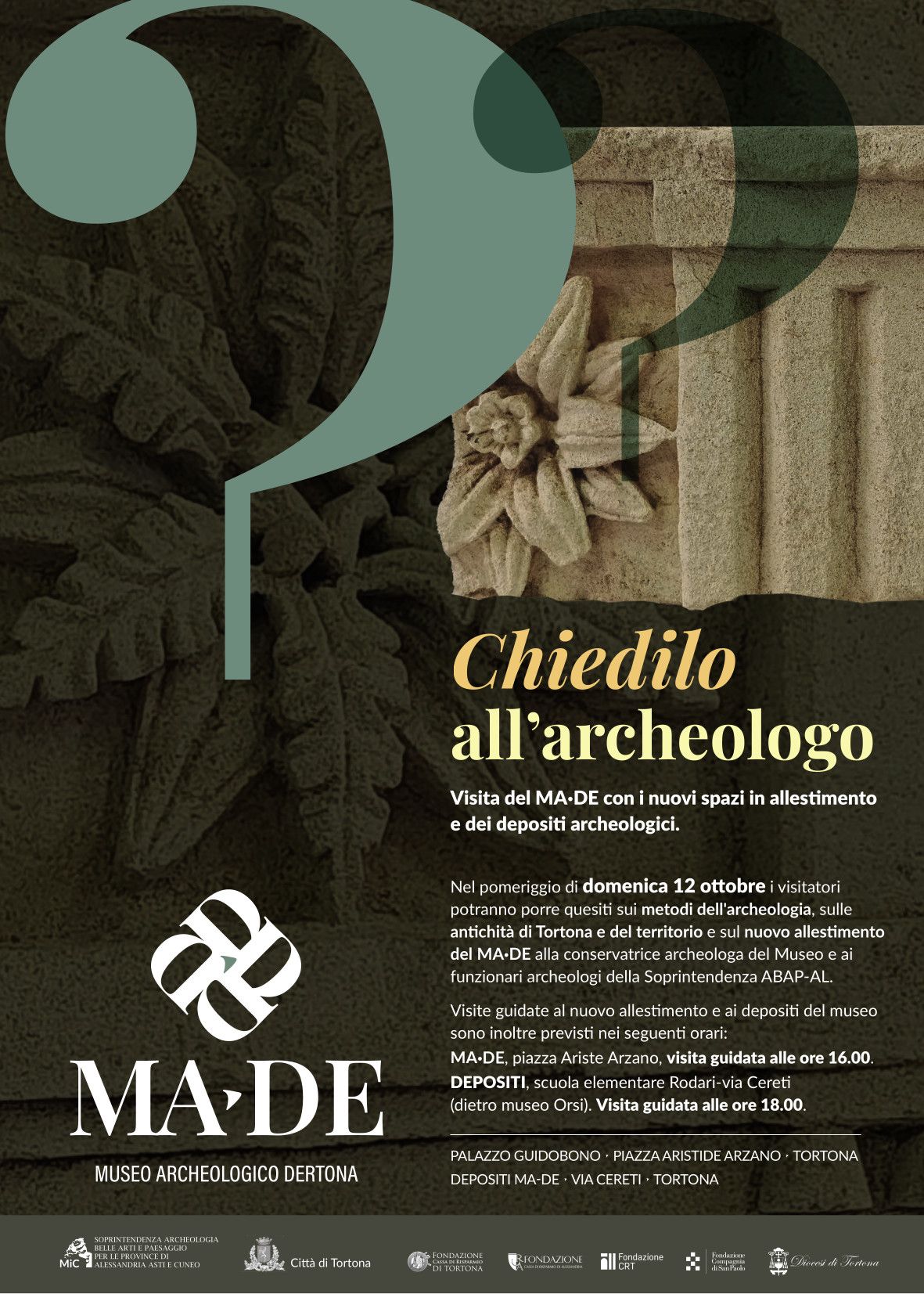 L’iniziativa, dal titolo “Chiedilo all’archeologo”, offrirà al pubblico l’occasione unica di dialogare direttamente con la conservatrice archeologa del MA-DE e con i funzionari della Soprintendenza ABAP-AL, ponendo domande sui metodi dell’archeologia e sulle antichità di Tortona e del territorio.