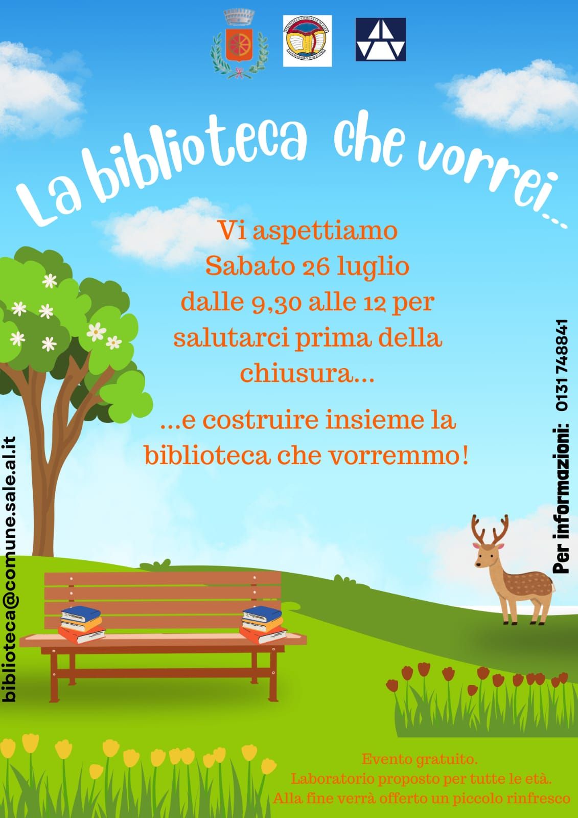 Sabato 26 luglio 2025, in occasione della Festa Patronale di Sant'Anna, la biblioteca di Sale ha voluto ascoltare i propri utenti e cittadini; la popolazione è stata infatti invitata a esprimere opinioni, consigli o desideri sul funzionamento della biblioteca. Ne sono uscite riflessioni stimolanti che, dove possibile, saranno ascoltate e prese in considerazione.
