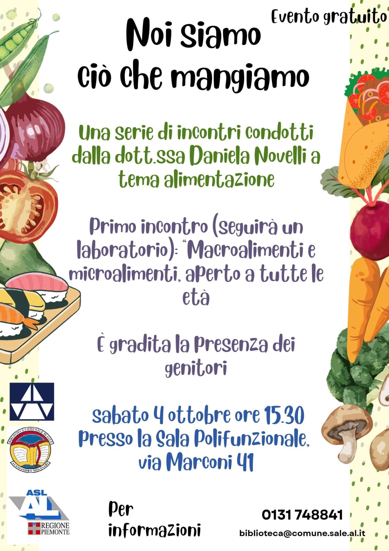 Vi aspettiamo sabato 4 ottobre alle ore 15,30 per il laboratorio "Noi siamo ciò che mangiamo, condotto dalla dott.ssa Daniela Novelli. L'evento si terrà nella Sala Polifunzionale di via Marconi, 41.