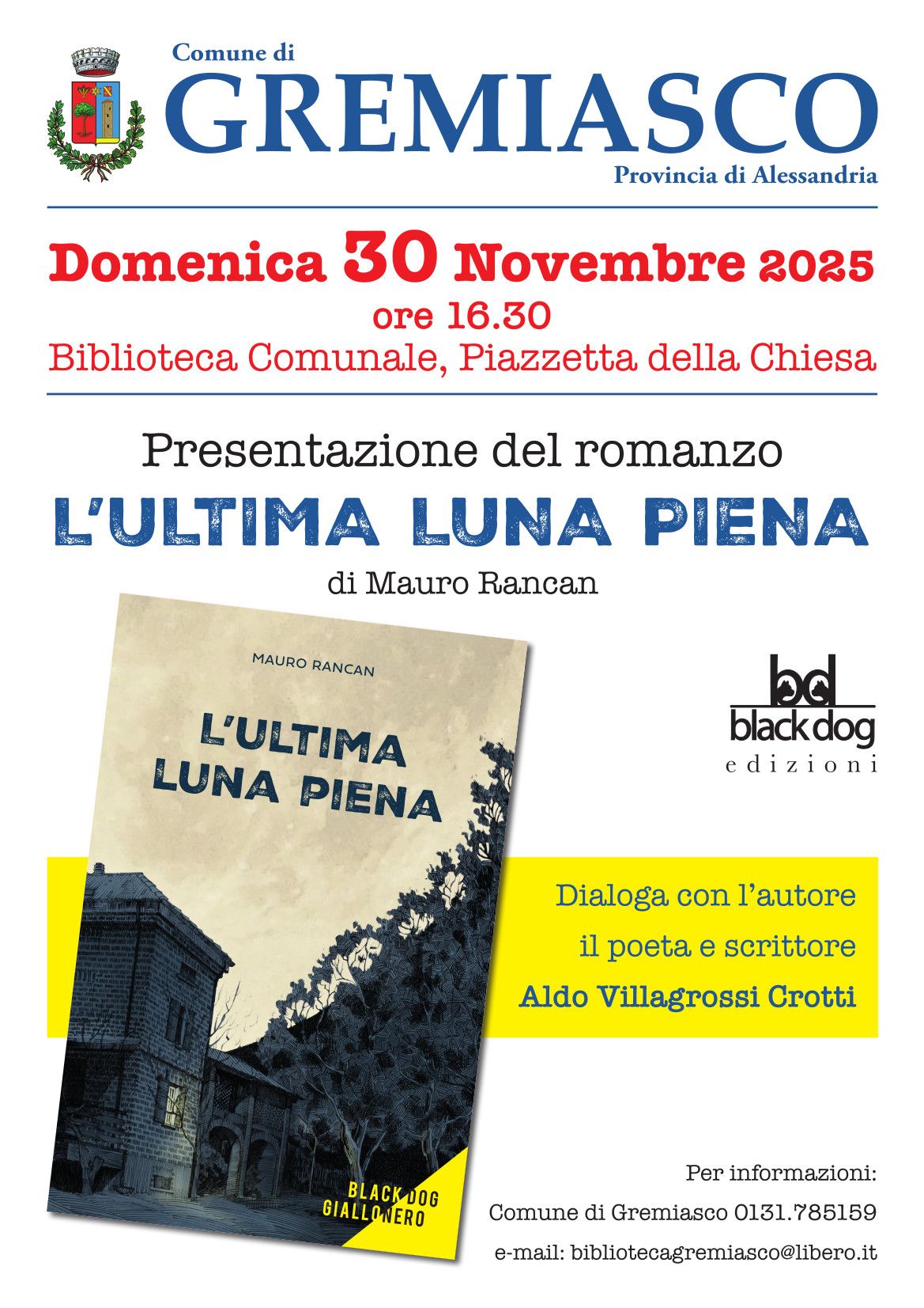 Gestore2025-11-24T14:44:43+01:00📚 Domenica 30 novembre, ore 16.30 – Biblioteca di Gremiasco Vi aspettiamo per un pomeriggio speciale dedicato ai libri e alle storie che lasciano il segno!Presenteremo il romanzo “L’ultima luna piena” di Mauro Rancan, pubblicato da Black Dog Edizioni.A dialogare con l’autore ci sarà il poeta e scrittore Aldo Villagrossi Crotti ✨ Un’occasione perfetta per scoprire [...]