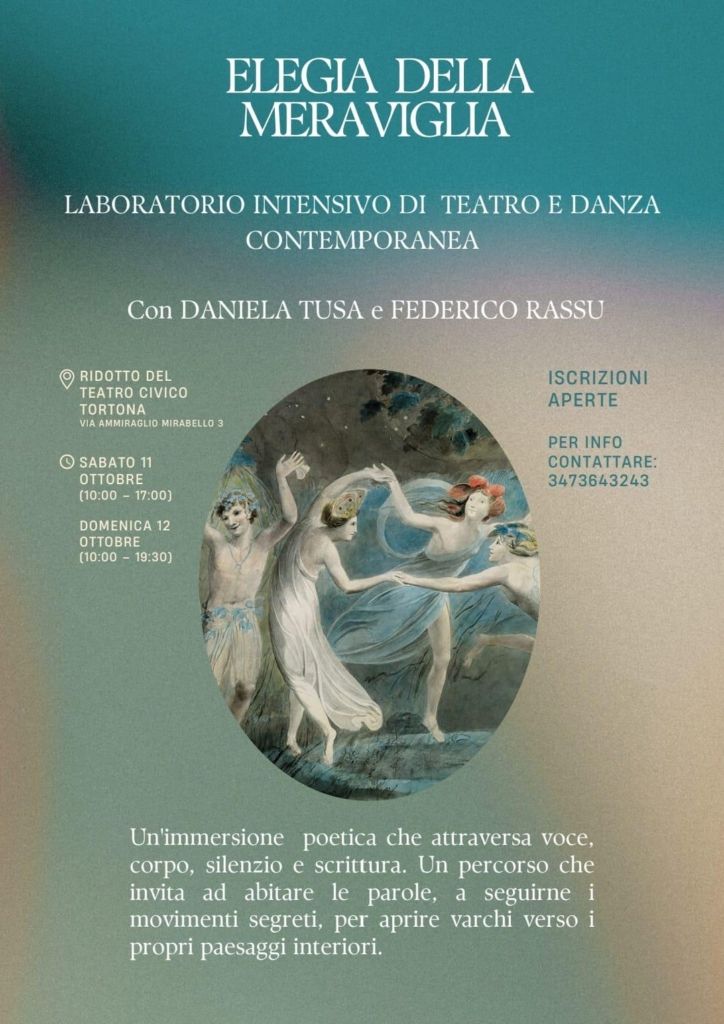 “Elegia della Meraviglia” è un laboratorio intensivo di teatro e danza contemporanea condotto da Daniela Tusa e Federico Rassu, che si terrà l’11 e 12 ottobre 2025 presso il Ridotto del Teatro Civico di Tortona (Via Ammiraglio Mirabello 3).