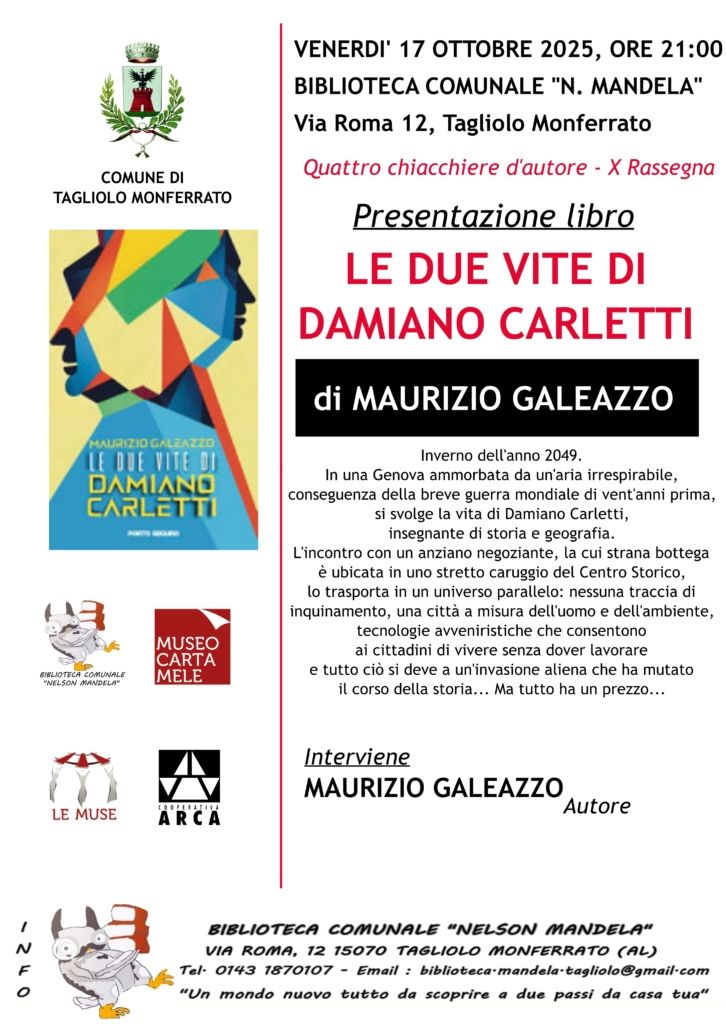 Prosegue la decima edizione della rassegna Quattro chiacchiere d’autore con un nuovo appuntamento dedicato alla narrativa contemporanea. Ospite della serata sarà Maurizio Galeazzo, autore del romanzo Le due vite di Damiano Carletti, che dialogherà con il pubblico e presenterà la sua opera.