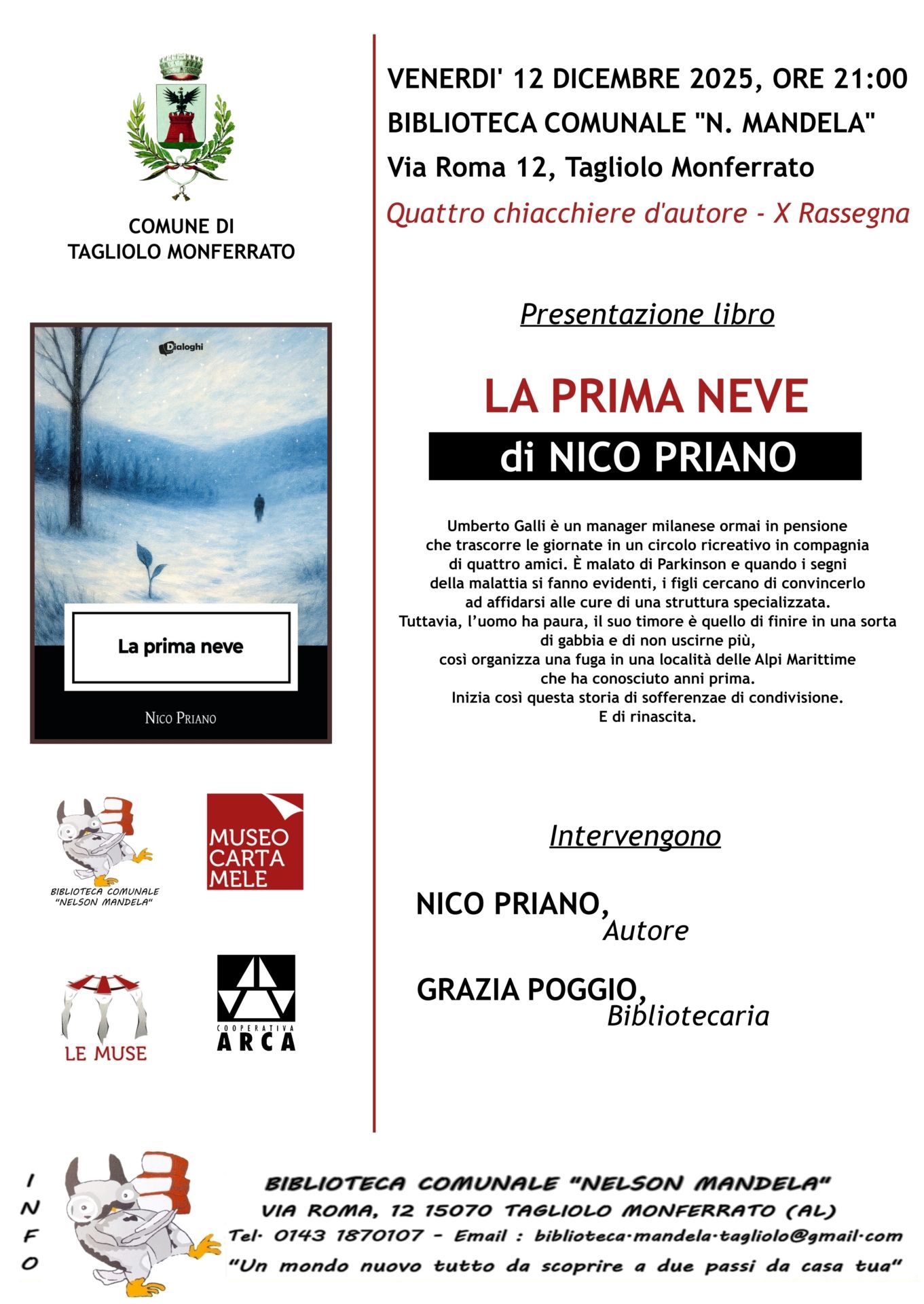 Presentazione del libro “La prima neve” di Nico Priano 📅 Venerdì 12 dicembre 2025, ore 21.00📍 Castello Pinelli Gentile – Sala della Bigattiera, Tagliolo Monferrato La Biblioteca Comunale “N. Mandela” [...]